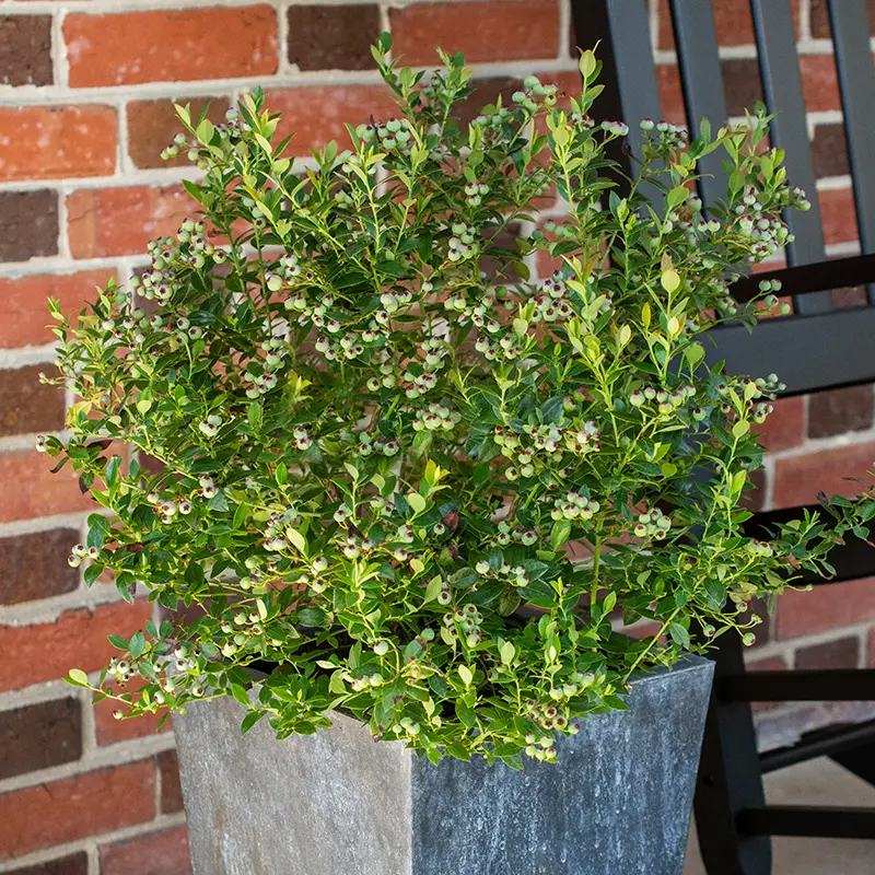 Patio-perfect! Blueberry Buckle® is a fast-growing bush that stays neat and compact, making it an ideal candidate for container-growing. Pretty white bell-shaped flowers appear in spring, giving way to sweet, dark blueberries with lots of flavor. The glossy, dark green foliage could easily be mistaken for a boxwood, which means it will add a classic (and edible) addition to any landscape. This drought-tolerant, low-chill variety is right at home in southern gardens. Thrives in acidic soil (pH of 4.5-5.5), so don’t forget the soil acidifier! Ripens in June. May be covered by USPP #22,521 or other patents. Corablue cultivar.