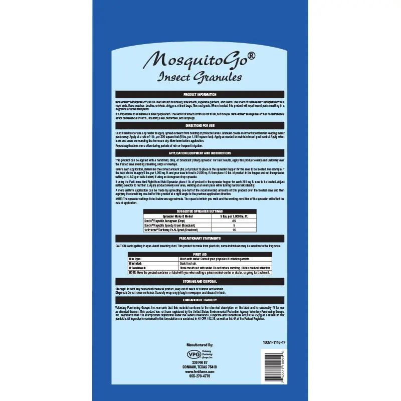 Ferti-lome® MosquitoGo® granules can be used around shrubbery, flowerbeds, vegetable gardens, and lawns. The scent of Ferti•lome® MosquitoGo® will repel ants, fleas, roaches, beetles, crickets, chiggers, chinch bugs, flies and gnats. Where treated, this product will repel insect pests resulting in a migration of unwanted pests. It is impossible to eliminate an insect population. The secret of insect control is not to kill, but to repel. Ferti•lome® MosquitoGo® has no detrimental effect on beneficial insects, including bees, butterflies, and ladybugs.