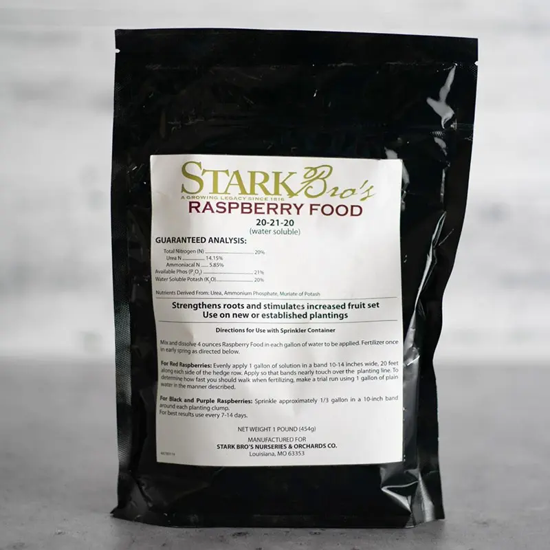 This specially formulated 20-21-20 raspberry fertilizer is recommended for use on new or established beds. Mix and dissolve 4 ounces of water-soluble fertilizer per 1 gallon of water. Use in early spring as directed for red, gold, purple and black raspberries. The package treats a linear 80-foot area.