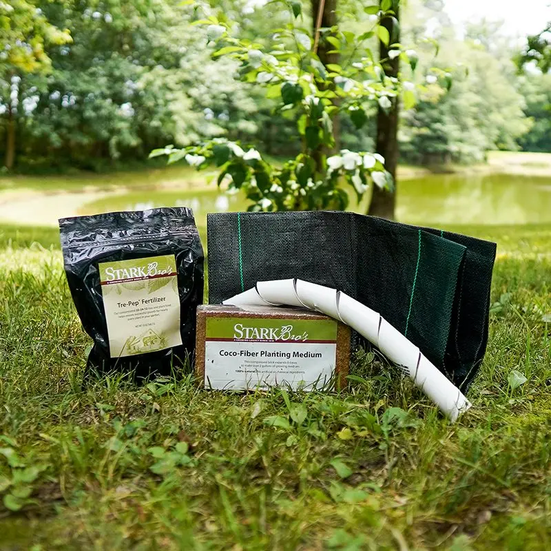 This kit includes soil amendments like a water-distributing coir fiber brick and our specially formulated fertilizer for young trees to help promote new growth and development from the roots up. We’ve included a weed-control barrier made of polypropylene mesh in a convenient 35-inch diameter circle to go around your tree to keep grass and weeds at bay – perfect for mulching over! You’ll also get a Tree Guard that, when used properly, protects the trunk from nibbling critter damage and sunscald.